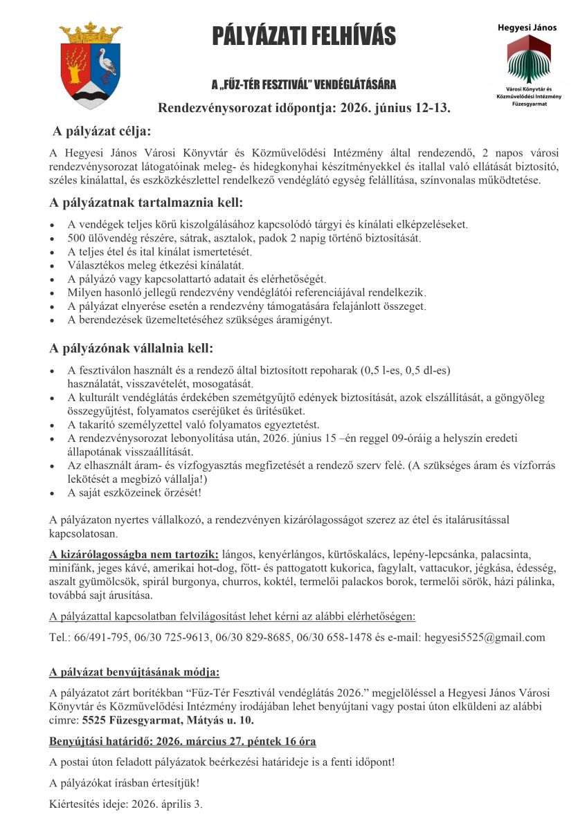 Fűz-Tér Fesztivál vendéglátás kiírás 2026.